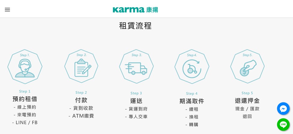 隨著台灣已進入高齡化社會,因應長者身體衰老逐漸不良於行,對於有輪椅需求者,通常需要實際操作過一段時間才能真正確認是否使用合宜,配合政府投入長照計畫相關補助,期盼改善經濟負擔,康揚提供照護者可透過官網線上、電話洽詢、甚至LINE、FB預約,付款完成後貨運或由專人交車,租賃期間以週或月計算,連同配件如電動輪椅用離電池、旅行袋、手機充電轉接器也開放承租,對於短期外出旅遊的長者十分便利,另外「先租後買」的服務若使用後有意願購買,可由租金折抵售價,共有13種車款可依不同需求承租,多元租售模式讓更多使用者可使用最適配的輪椅,增強行動力。